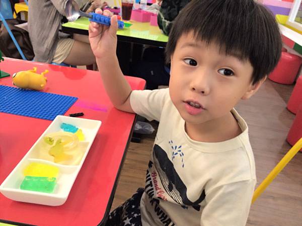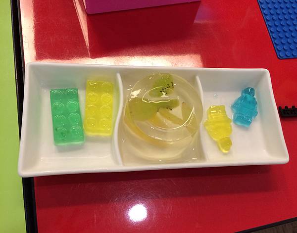 附餐的點心先上場,左邊的果凍做成積木模樣,右邊則是人偶造型